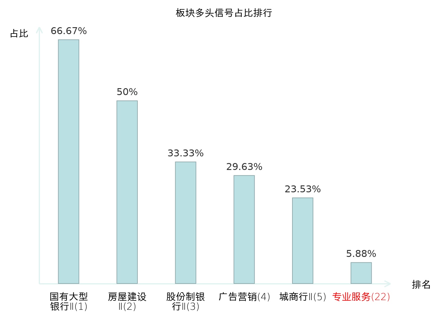 全市场所有行业板块中主力多头信号占比排名中,国有大型银行Ⅱ板块位居第一。国有大型银行Ⅱ板块名次提升最快,较昨日上升122位。
