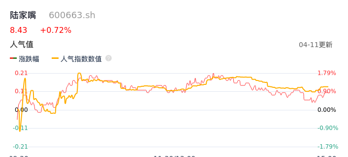 04月11日,陆家嘴收报8.43,股价涨幅0.72%,成交金额2761.04万元,换手率0.11%。