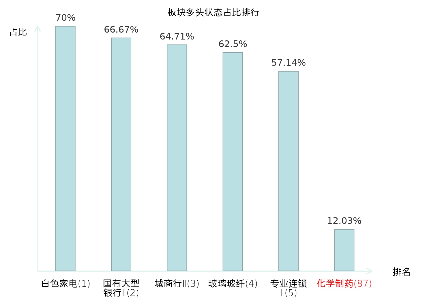 全市场所有行业板块中主力多头状态占比排名中,白色家电板块位居第一。油气开采Ⅱ板块名次提升最快,较昨日上升96位。