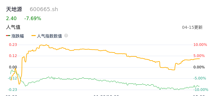 04月15日,天地源收报2.40,股价涨幅-7.69%,成交金额4970.88万元,换手率2.38%。