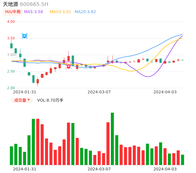 04月03日,天地源收报2.84,股价涨幅-0.35%,成交金额2465.10万元,换手率1.01%。