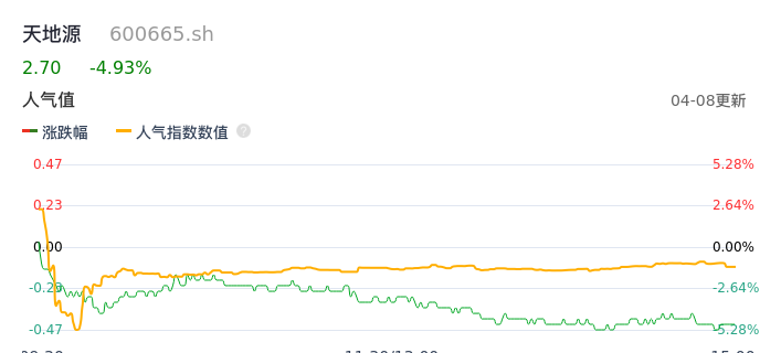 04月08日,天地源收报2.70,股价涨幅-4.93%,成交金额3793.74万元,换手率1.60%。