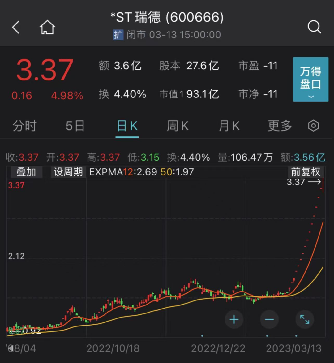 *ST瑞德股价此轮大涨始于2月14日。数据显示,2月14日至3月7日,*ST瑞德股价连续15个交易日涨停,涨幅约108%。