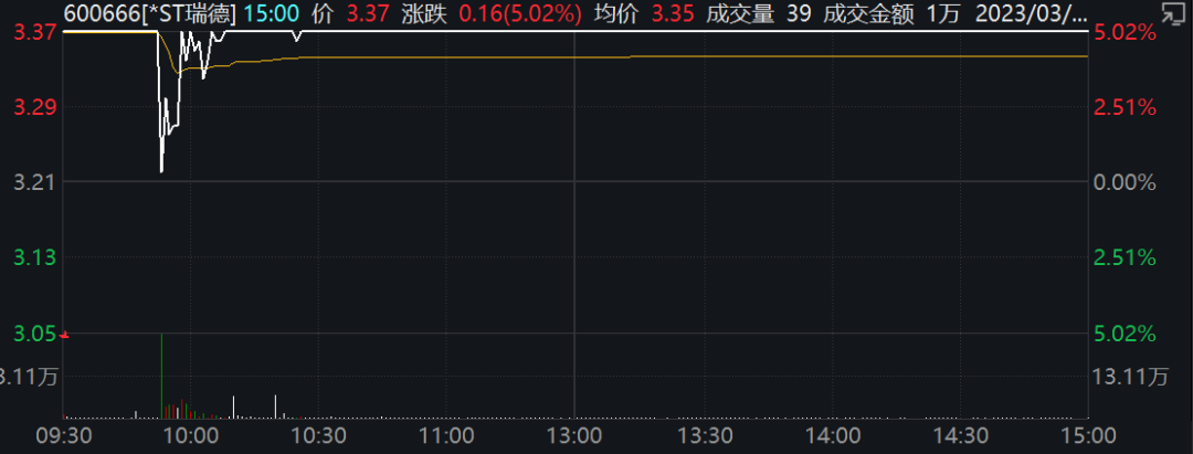 3月13日开盘后,*ST瑞德继续涨停,股价报3.37元/股。在当日9时50分左右,*ST瑞德开板,成交量放大。经历短时间震荡后,再度涨停封板。截至收盘,涨停封单近5.3万手。