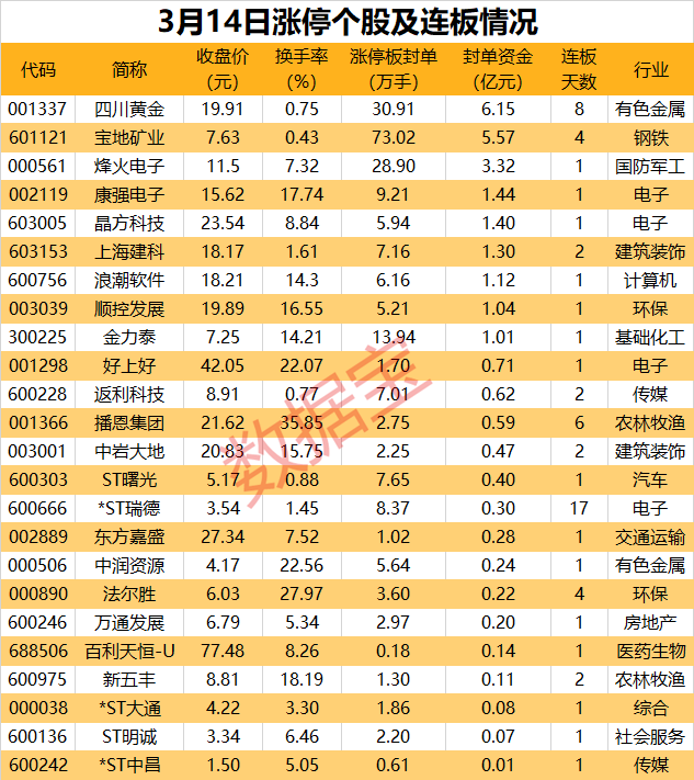从涨停连板情况来看,四川黄金、宝地矿业、上海建科为近期上市新股,尚未打开一字涨停板,分别为8连板、4连板、2连板;*ST瑞德晋级17连板,播恩集团6连板,法尔胜4连板;返利科技、中岩大地、新五丰均为2连板。