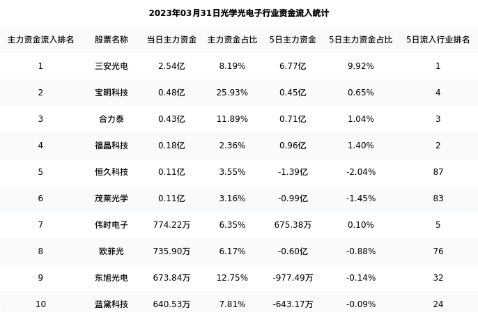 从主力资金流向来看,光学光电子行业今日主力资金流入49.95亿元,在所有申万二级行业中排名:107/737。