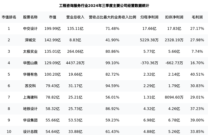 太极实业最新报告期数据为三季度,下表汇总了工程咨询服务行业内市值靠前的公司三季度主要经营数据