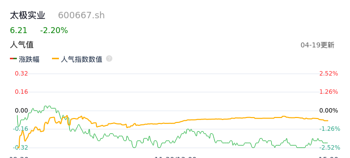 04月19日,太极实业收报6.21,股价涨幅-2.20%,成交金额2.43亿元,换手率1.85%。