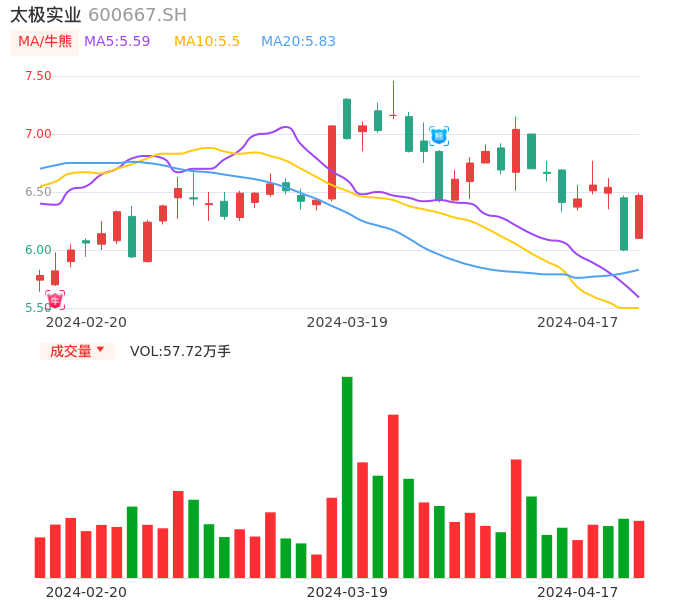 04月17日,太极实业收报6.47,股价涨幅7.83%,成交金额3.66亿元,换手率2.74%。