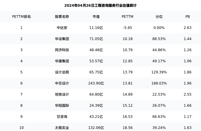 太极实业最新报告期数据为一季度,下表汇总了工程咨询服务行业内市值靠前的公司一季度主要经营数据