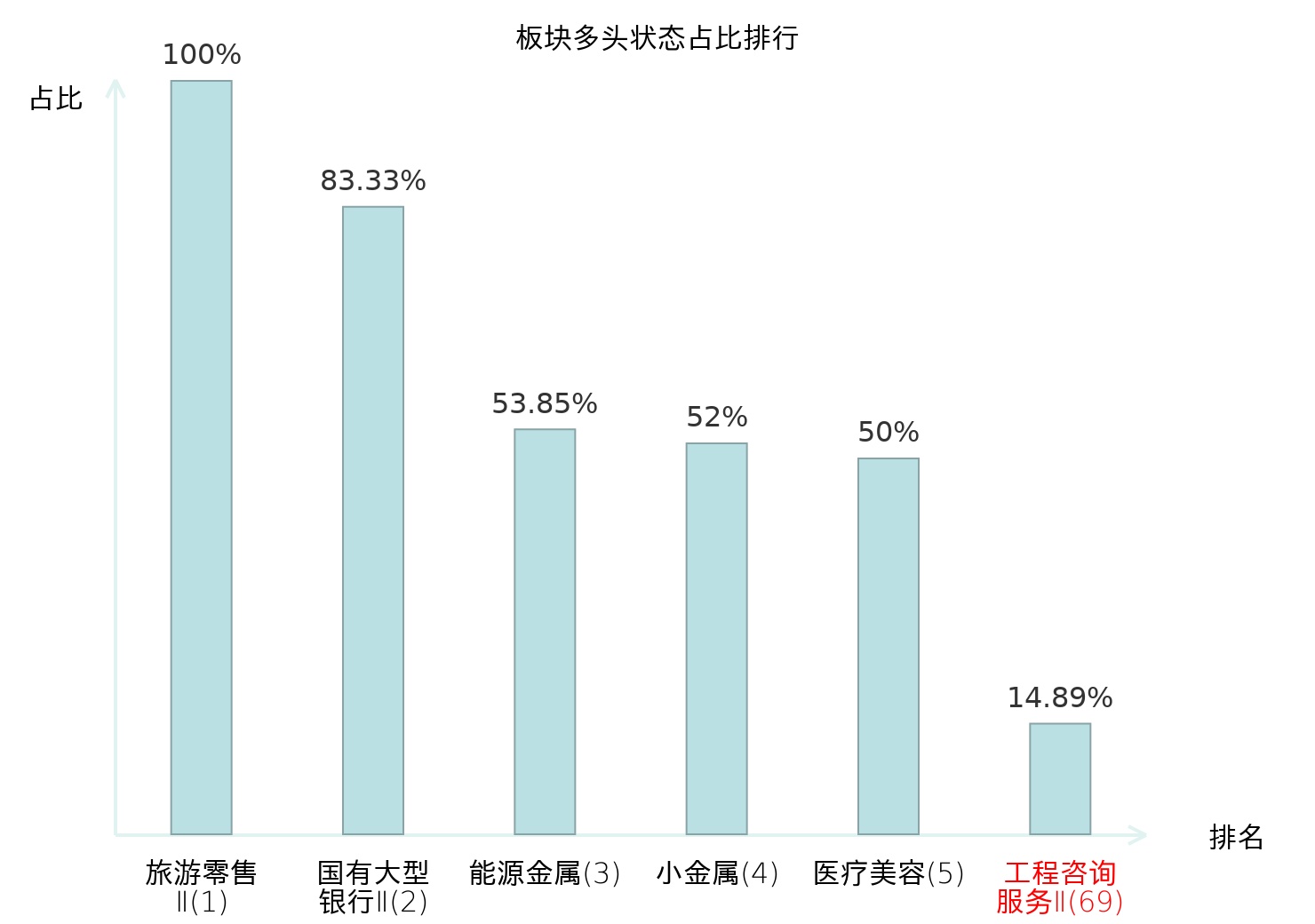 全市场所有行业板块中主力多头状态占比排名中,旅游零售Ⅱ板块位居第一。旅游零售Ⅱ板块名次提升最快,较昨日上升130位。