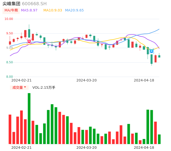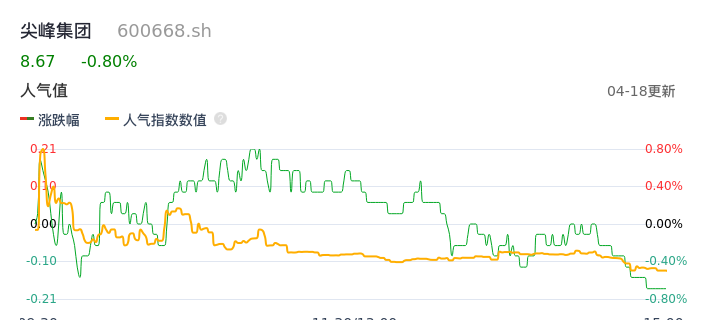 04月18日,尖峰集团收报8.67,股价涨幅-0.80%,成交金额1876.77万元,换手率0.62%。