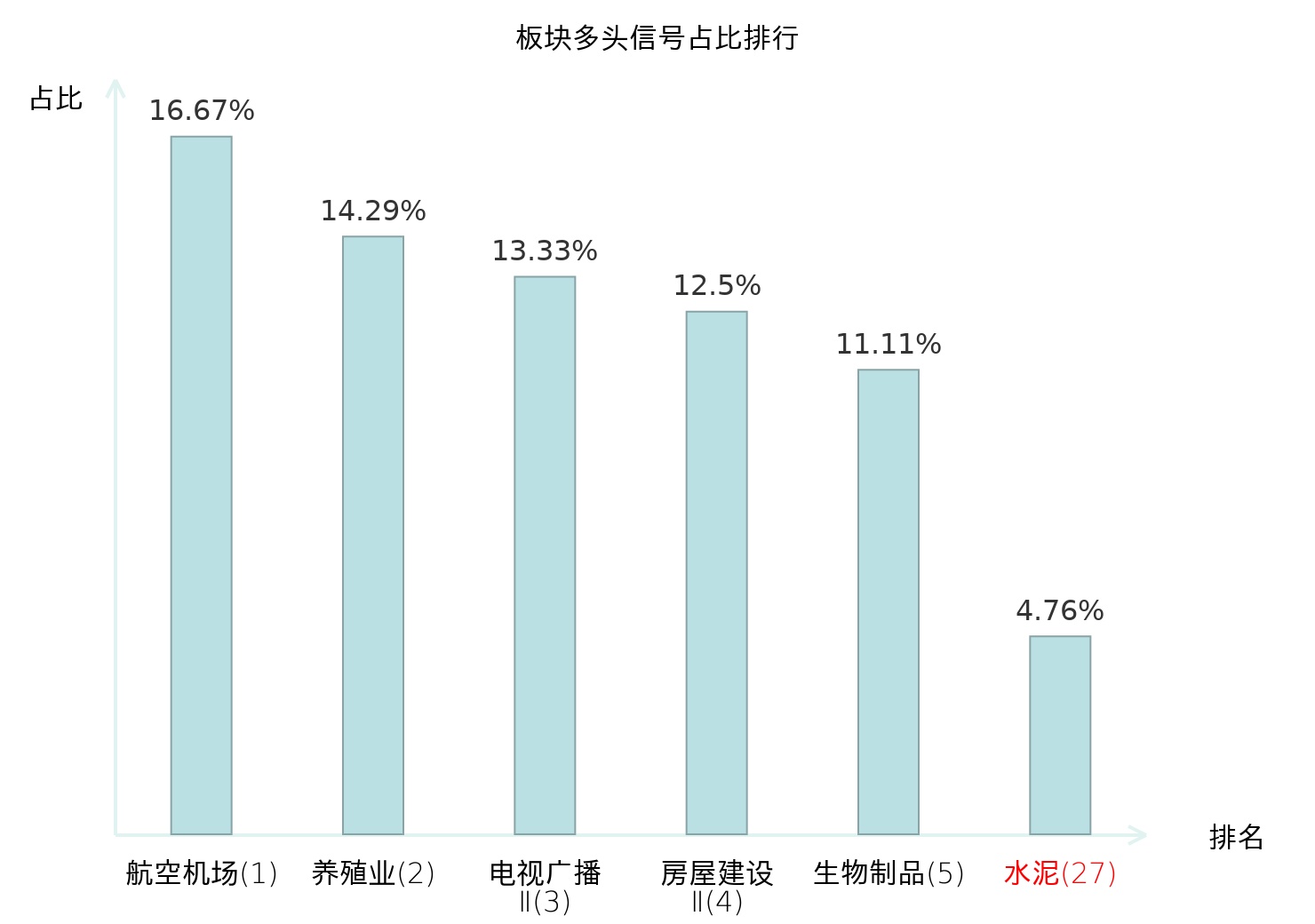 全市场所有行业板块中主力多头信号占比排名中,航空机场板块位居第一。航空机场板块名次提升最快,较昨日上升113位。