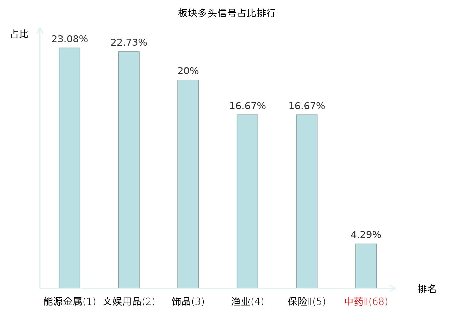全市场所有行业板块中主力多头信号占比排名中,能源金属板块位居第一。保险Ⅱ板块名次提升最快,较昨日上升120位。