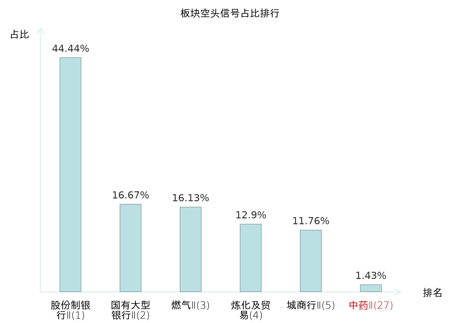 全市场所有行业板块中主力空头信号占比排名中,股份制银行Ⅱ板块位居第一。软件开发板块名次提升最快,较昨日上升102位。