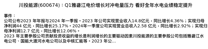 值得注意的是:2024年04月天风证券的郭丽丽分析师,首次发布关于川投能源的研究报告,标题为:川投能源(600674):Q1雅砻江电价增长对冲电量压力 看好全年水电业绩稳定提升。