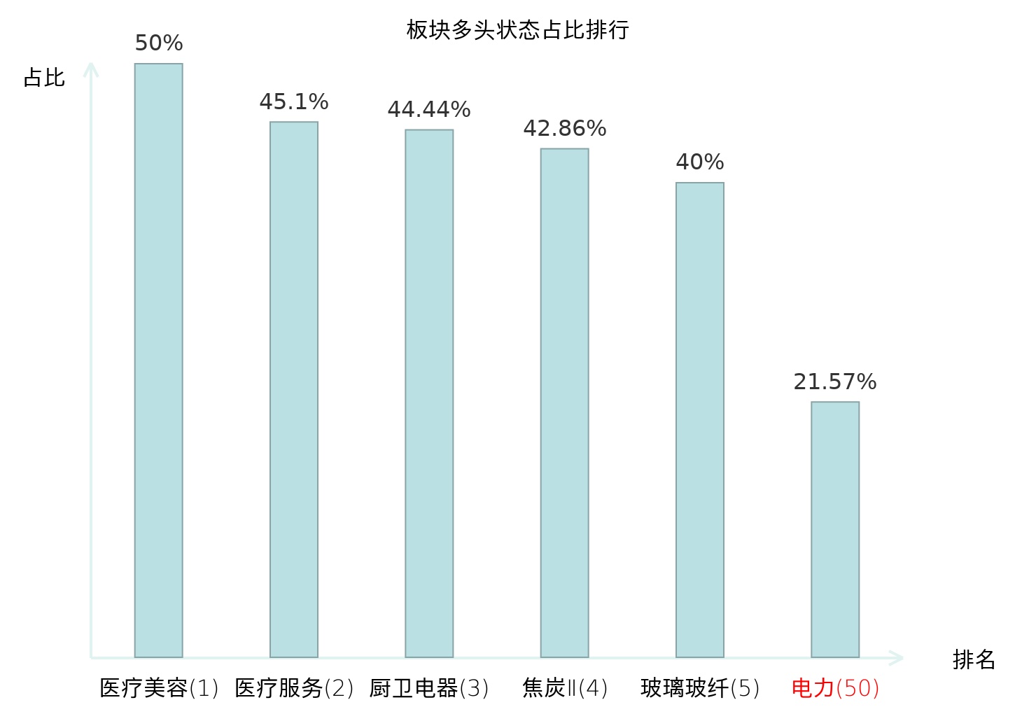 全市场所有行业板块中主力多头状态占比排名中,医疗美容板块位居第一。养殖业板块名次提升最快,较昨日上升90位。