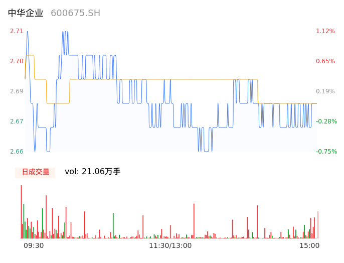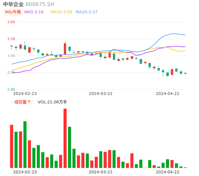04月22日,中华企业收报2.68,股价涨幅0.00%,成交金额5649.39万元,换手率0.35%。