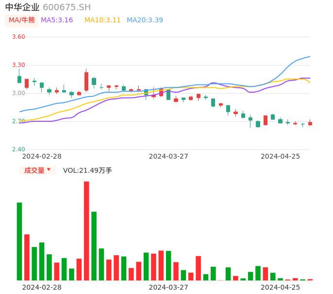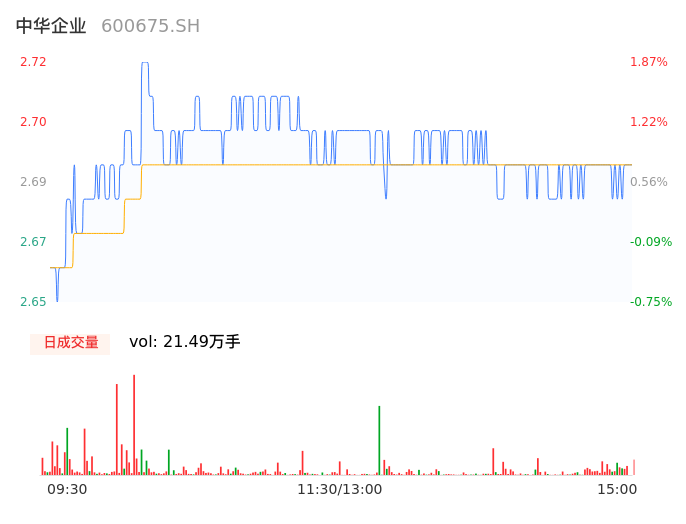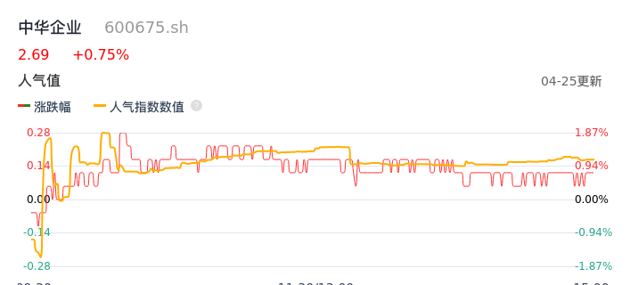 04月25日,中华企业收报2.69,股价涨幅0.75%,成交金额5783.26万元,换手率0.35%。