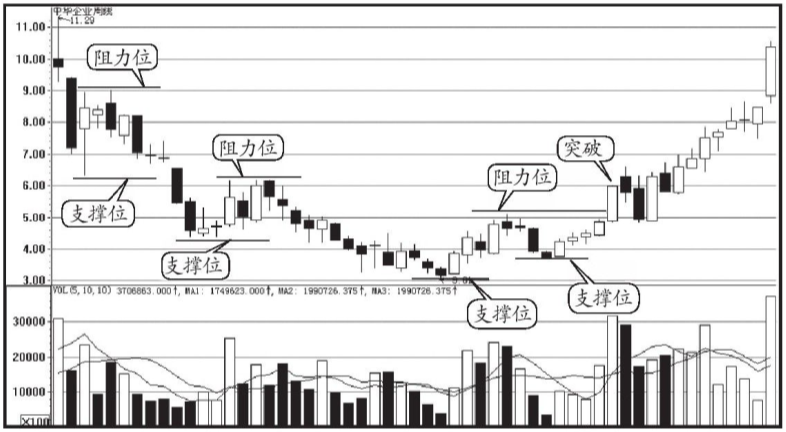 当股价在下探到3.01元后,趋势发生了变化,此后的股价没有再次跌破3.01元的低点而是开始逐步回升。在图中标识处放量突破了前面的阻力位,并成功地站在了阻力位的上方。可以确认此次股价对阻力位的突破为有效突破。这预示着下降趋势的结束和上升趋势的开始。此时投资者可以积极入场。