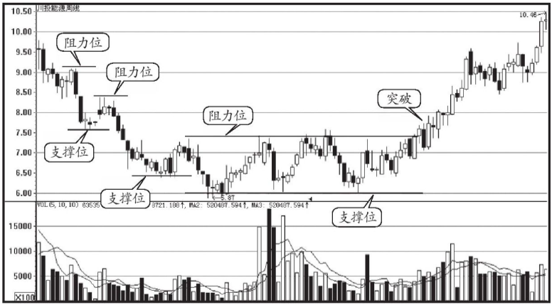突破阻力位是指在下降趋势中,每个支撑位一般都低于前一个支撑位,每个阻力位也低于前一个阻力位,如果新一轮的上涨有效突破前一个阻力位水平区域,就可能意味着趋势由下降反转为上升,如图5-3所示。