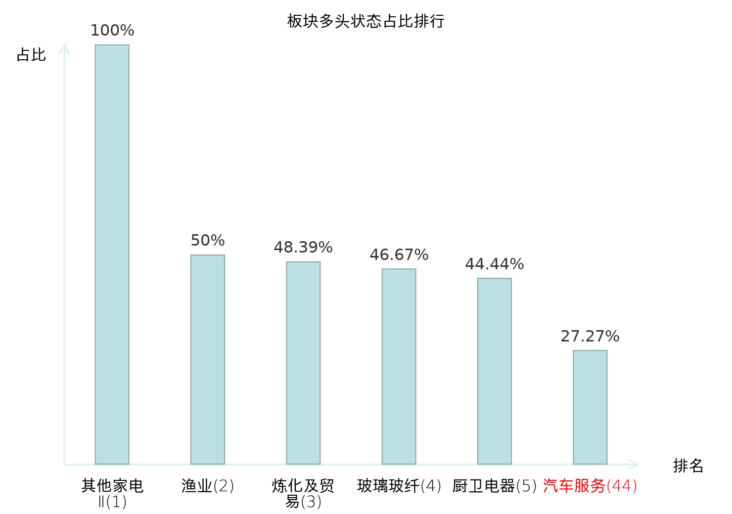 全市场所有行业板块中主力多头状态占比排名中,其他家电Ⅱ板块位居第一。冶钢原料板块名次提升最快,较昨日上升67位。