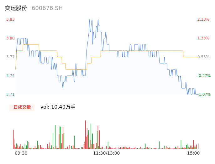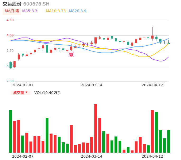 04月12日,交运股份收报3.72,股价涨幅-0.80%,成交金额3922.13万元,换手率1.01%。