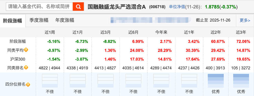但在2025年,截至11月26日,该基金年内涨幅2.17%,进入行业倒数5%。