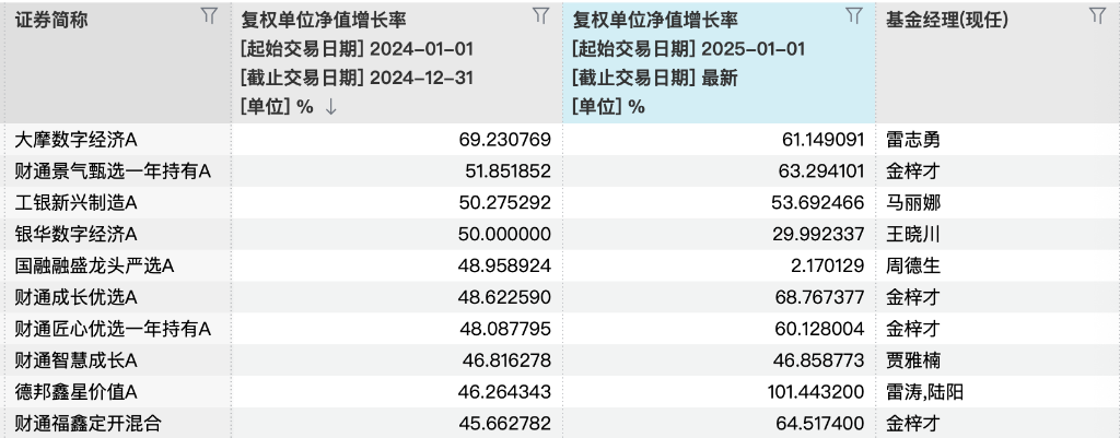 更甚至,雷涛等管理的德邦鑫星在2024年涨幅前十的基础上,今年净值也已经实现翻倍。