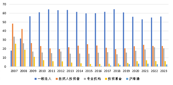 专业机构包括券商自营、投资基金、社保基金、保险资金、资产管理及QFII等,多为长期资金。从2007年至2023年的历史变化来看,专业机构比例自2015年后有所提升,但仍低于个人投资者。