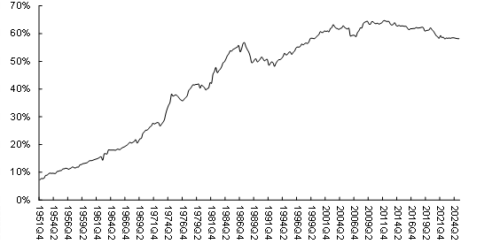 根据美国联邦储备局报告,自1954年以来,美股机构持仓比例(个人和家族除外)持续攀升,进入1986年短暂回落后又持续往上。进入到21世纪维持在60%左右的水平,近15年趋势则为区间内震荡。
