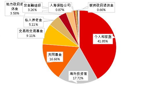 截至2025年一季度,个人和家族占比为41.85%,剩下的机构投资者中,海外投资者、共同基金、交易所交易基金、私人养老金等占比较高,分别为17.72%、16.66%、9.11%和5.11%,均在5%以上,且均为长期机构。实际上,美股家族企业某种意义上也是一类长期资金,因而美股的长期机构占比还要更高。