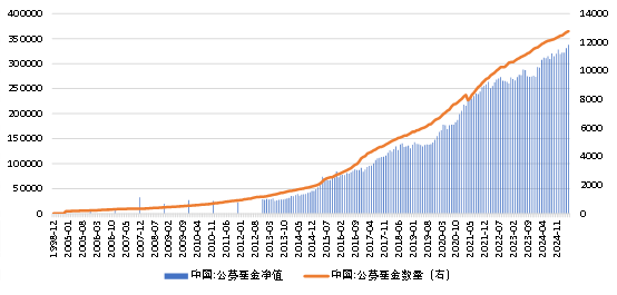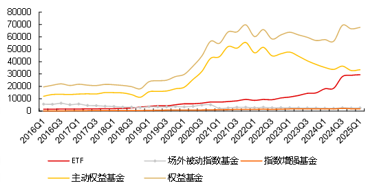 截至2025年一季度,权益基金规模为6.77万亿,距离2021年的6.98万亿相差不大。从时序来看,2018年资管新规推动银行理财等资金净值化转型,权益类基金规模获得爆发式增长。随后市场回落,规模维持震荡。总体而言,权益基金规模震荡往上,不断推动市场发展。