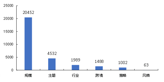 ETF分为多种类型,包括规模指数、主题指数、行业指数、策略指数和风格指数,从规模分布来看,主要集中在宽基ETF基金上,故ETF风格更偏向于大市值标的。