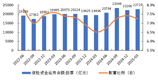 除股票以外,保险公司亦通过配置公募基金的方式间接投资股票。截至2025年一季度,保险资金配置权益型基金的规模分别为14,626亿元和1,872亿元,合计16,498亿元,投资比例分别为8.28%和3.60%。