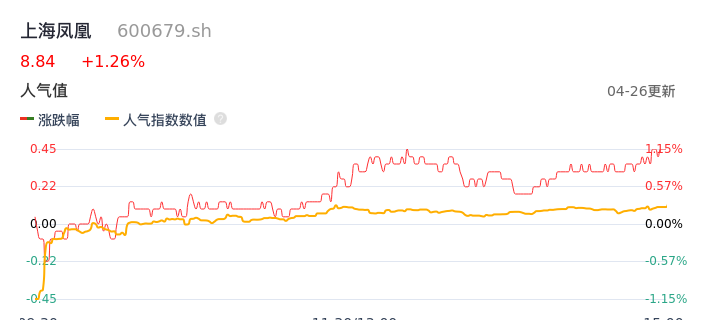 04月26日,上海凤凰收报8.84,股价涨幅1.26%,成交金额3445.67万元,换手率1.26%。