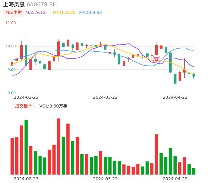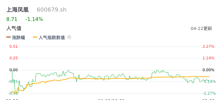 04月22日,上海凤凰收报8.71,股价涨幅-1.14%,成交金额3142.34万元,换手率1.15%。