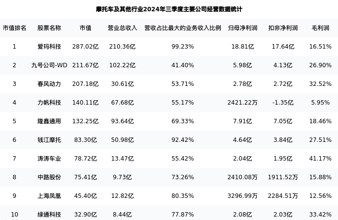 上海凤凰最新报告期数据为三季度,下表汇总了摩托车及其他行业内市值靠前的公司三季度主要经营数据