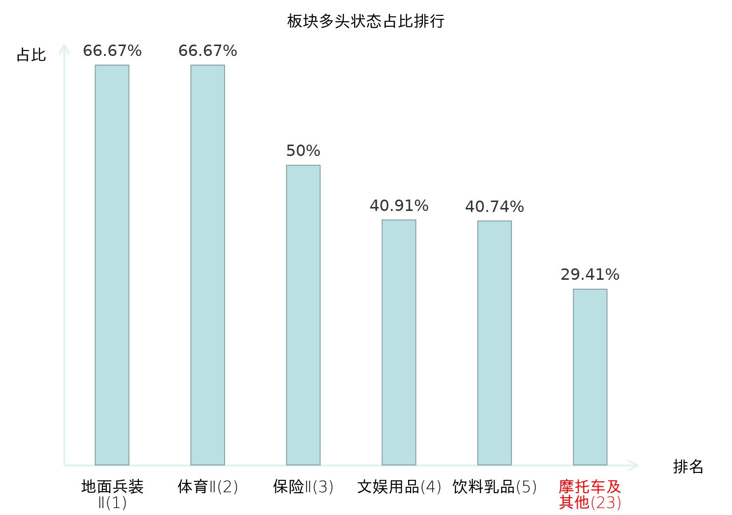 全市场所有行业板块中主力多头状态占比排名中,地面兵装Ⅱ板块位居第一。电视广播Ⅱ板块名次提升最快,较昨日上升82位。