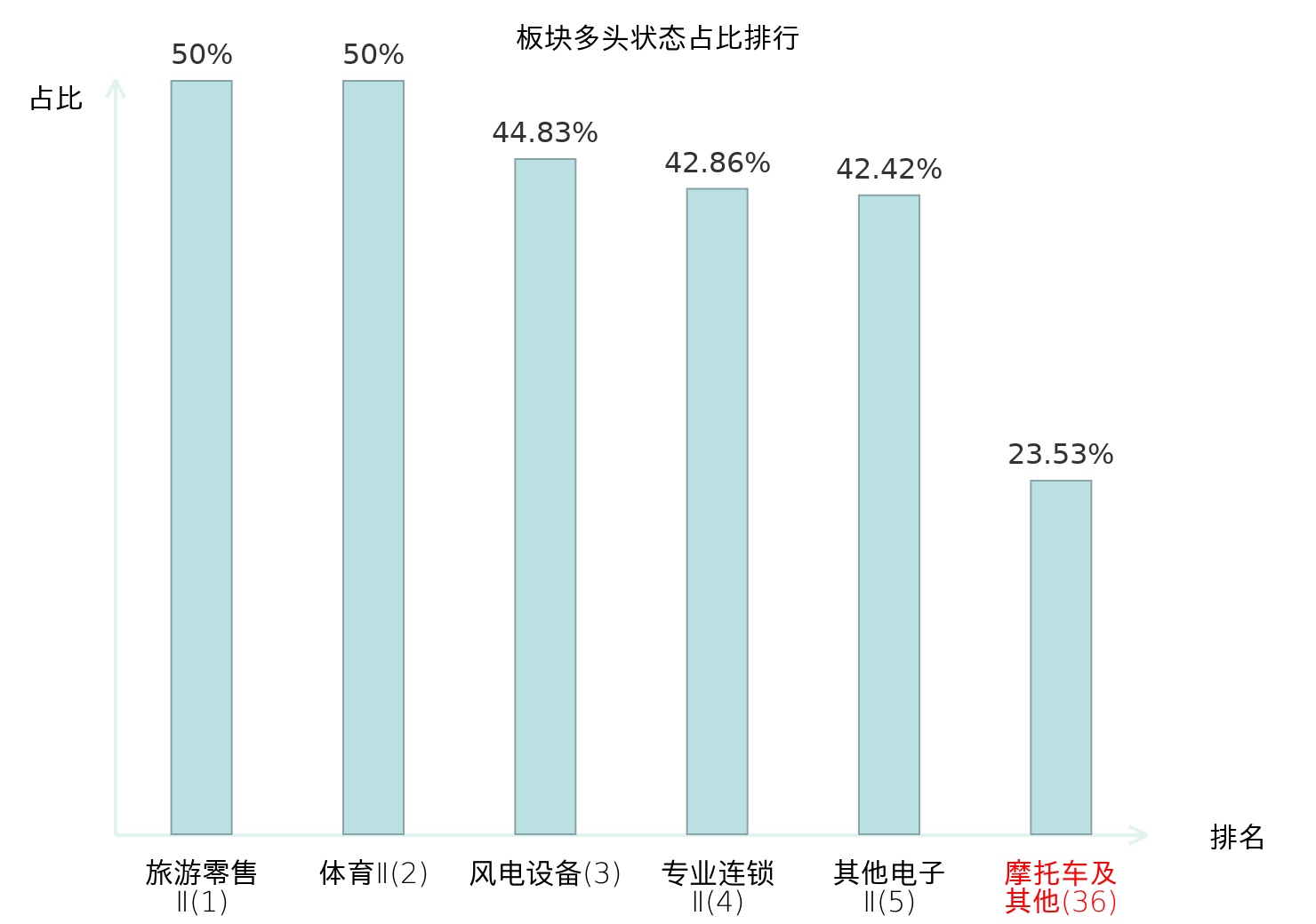 全市场所有行业板块中主力多头状态占比排名中,旅游零售Ⅱ板块位居第一。化妆品板块名次提升最快,较昨日上升66位。