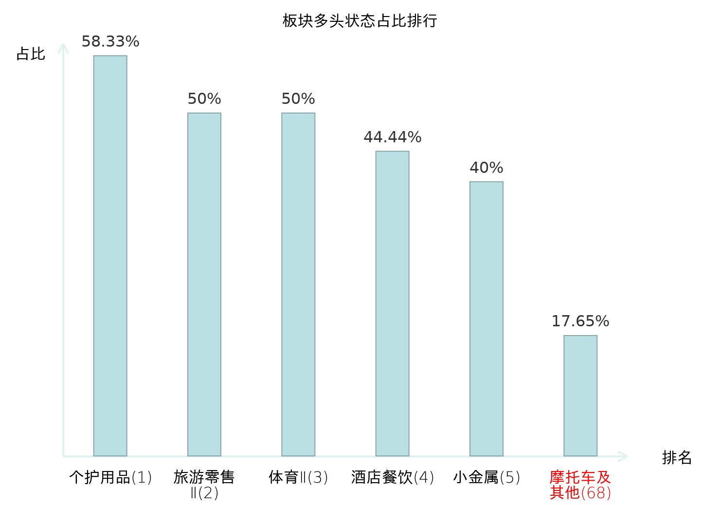 全市场所有行业板块中主力多头状态占比排名中,个护用品板块位居第一。乘用车板块名次提升最快,较昨日上升87位。