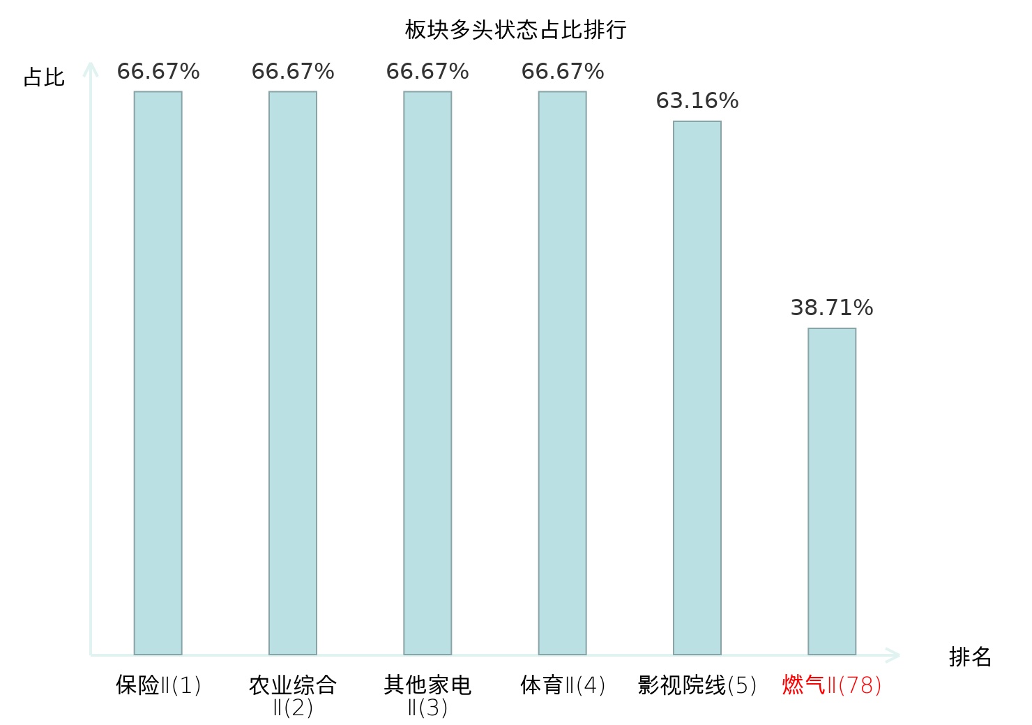 全市场所有行业板块中主力多头状态占比排名中,保险Ⅱ板块位居第一。冶钢原料板块名次提升最快,较昨日上升53位。