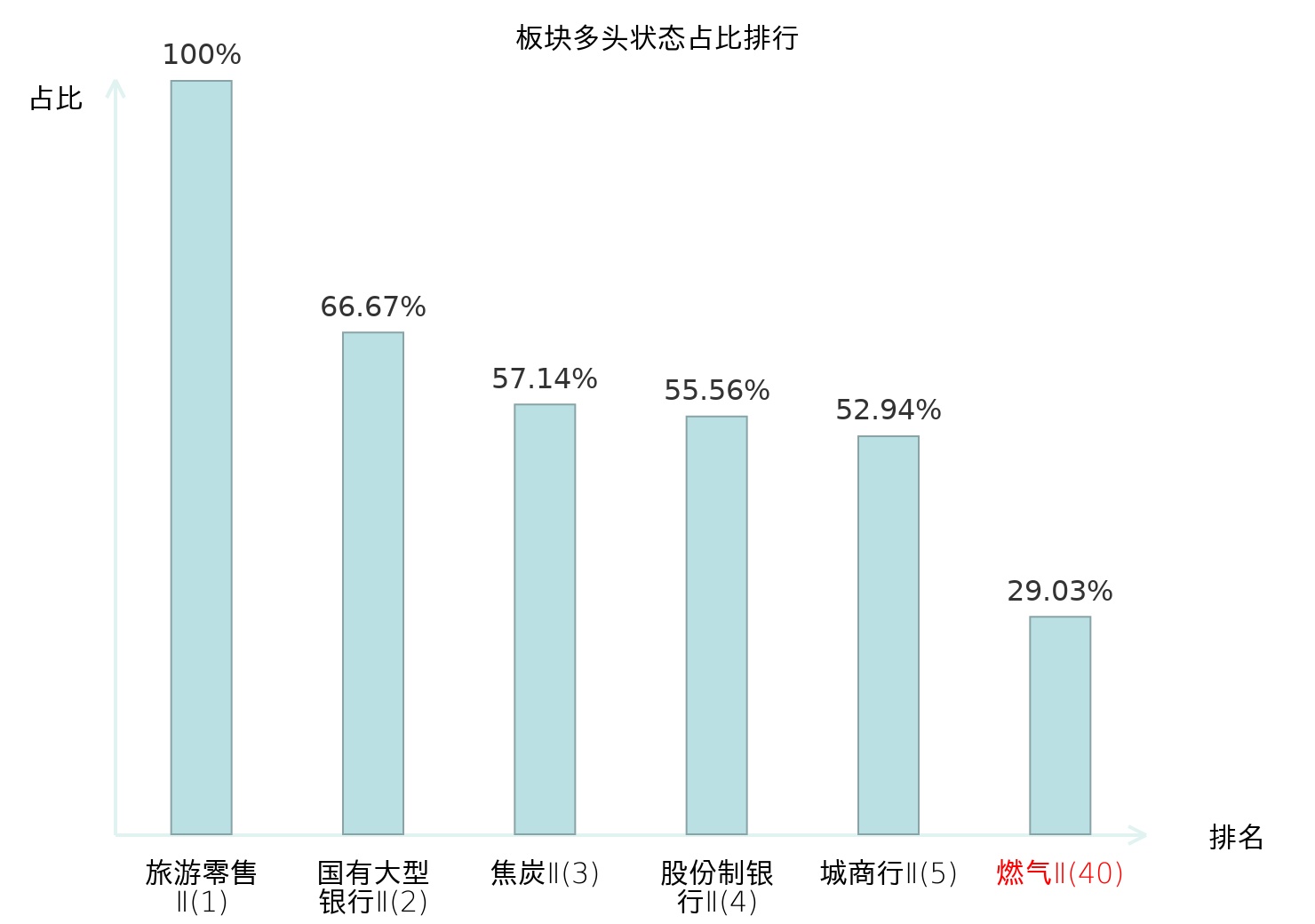 全市场所有行业板块中主力多头状态占比排名中,旅游零售Ⅱ板块位居第一。其他家电Ⅱ板块名次提升最快,较昨日上升101位。