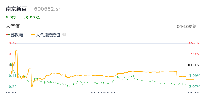 04月16日,南京新百收报5.32,股价涨幅-3.97%,成交金额9126.25万元,换手率1.46%。