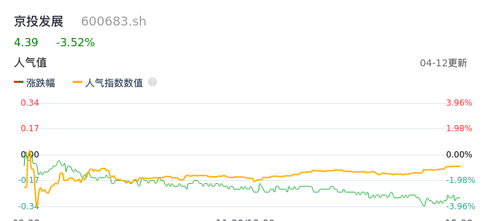 04月12日,京投发展收报4.39,股价涨幅-3.52%,成交金额1.25亿元,换手率3.79%。