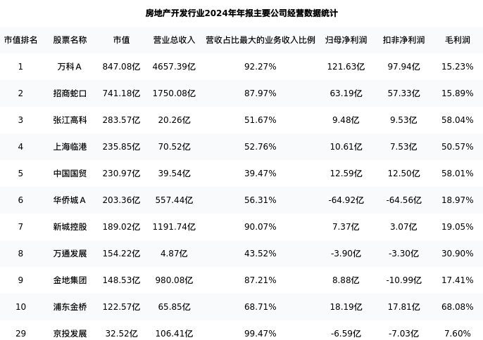 京投发展最新报告期数据为年报,下表汇总了房地产开发行业内市值靠前的公司年报主要经营数据