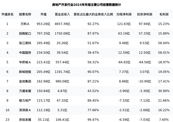 京投发展最新报告期数据为年报,下表汇总了房地产开发行业内市值靠前的公司年报主要经营数据