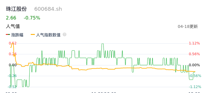 04月18日,珠江股份收报2.66,股价涨幅-0.75%,成交金额2026.46万元,换手率0.89%。