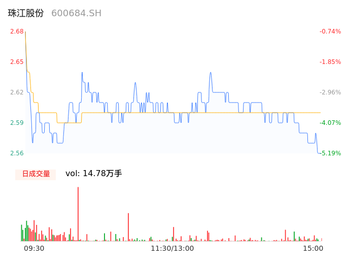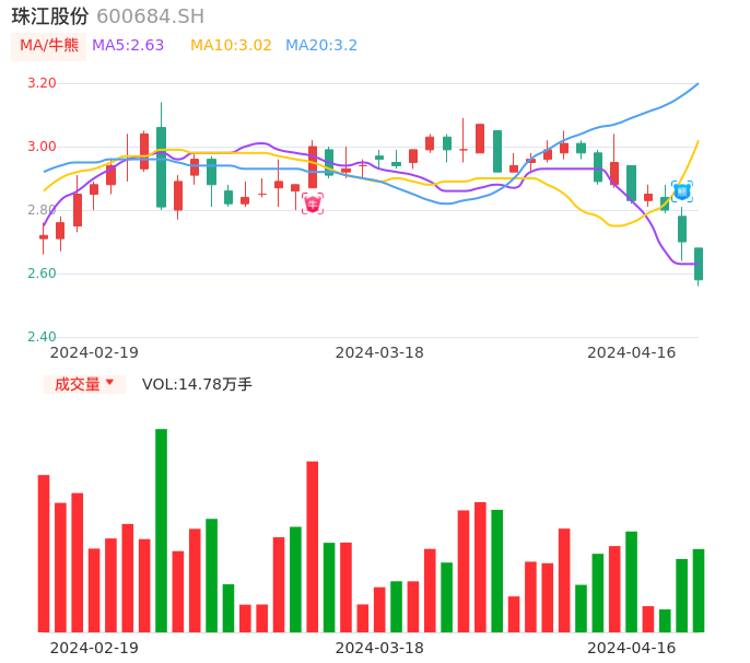 04月16日,珠江股份收报2.58,股价涨幅-4.44%,成交金额3842.68万元,换手率1.73%。