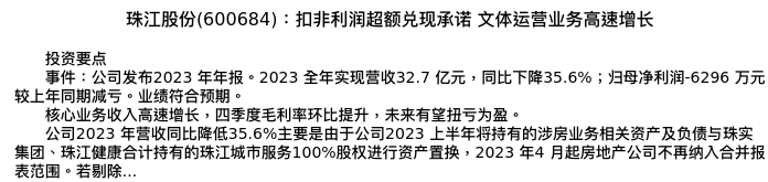 值得注意的是:2024年03月东吴证券的房诚琦/肖畅/白学松分析师,首次发布关于珠江股份的研究报告,标题为:珠江股份(600684):扣非利润超额兑现承诺 文体运营业务高速增长。